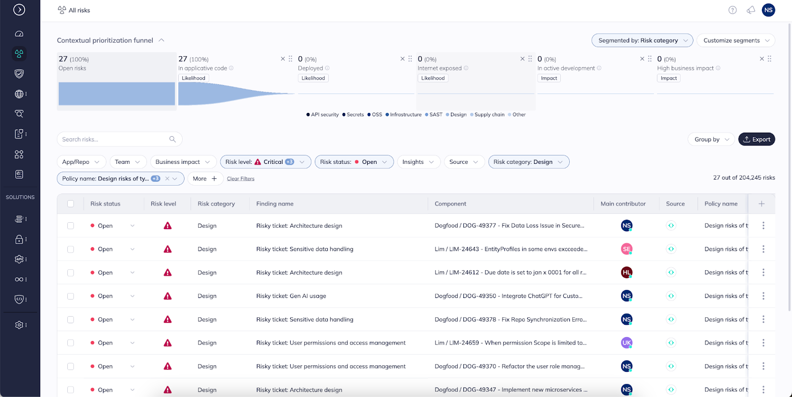 Enhance the content of identified risks by mapping them to specific commits, branches, pull requests, and code components like APIs, GenAI frameworks, PII fields, etc. This mapping provides deeper insights into how potential security issues might manifest in the codebase.