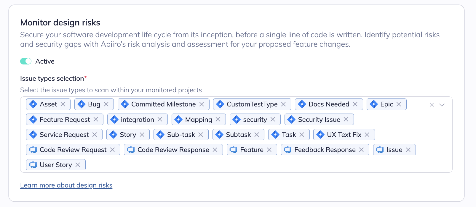 Connect your organization’s ticketing system with Apiiro to automatically pull relevant tickets and issues. Apiiro supports popular systems like Jira, GitHub Issues, Azure DevOps Boards, etc. to streamline the process of identifying risks at the design phase.