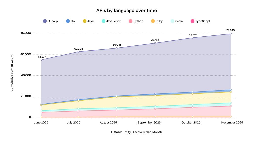 Between June and October 2025, API surface records grew from 54,627 to 79,630 (+44%), representing 53,598 unique API definitions in code across 2,033 repositories. Of these, 72.5% are internal controller actions while 27.5% (14,743) are REST-style HTTP endpoints. This represents a roughly 40% increase in the attack surface in under six months.