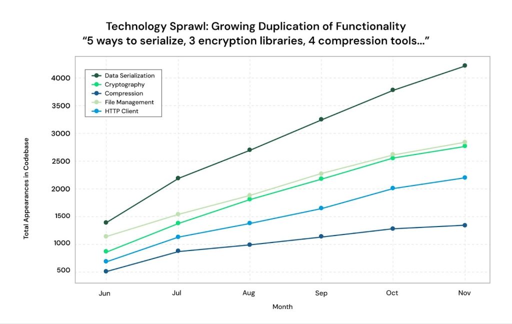 Across major functional categories such as database, data serialization, logging, testing, cryptography, HTTP clients, and compression, organizations are using hundreds to thousands of different packages for the same purpose.