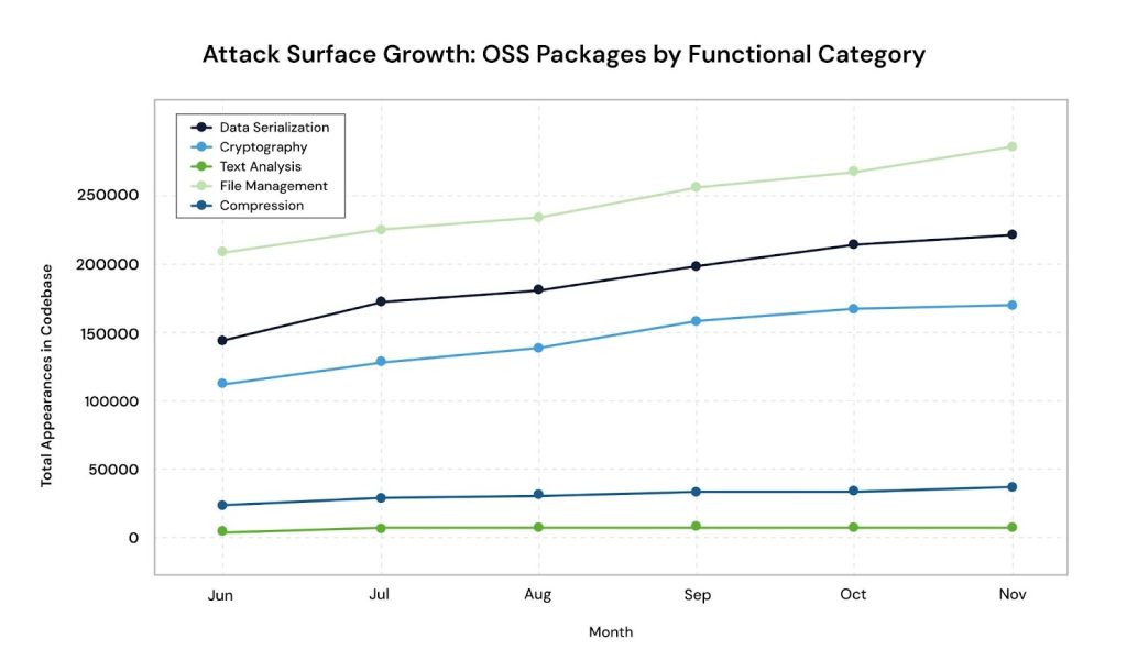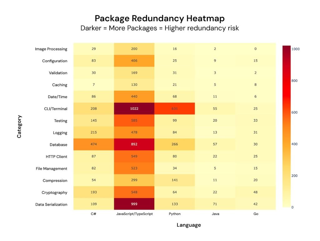 This analysis of 4.7 million OSS package records across 9,352 repositories reveals a concerning trend: organizations are experiencing significant package sprawl, where multiple packages perform the same function and dramatically expand the attack surface.