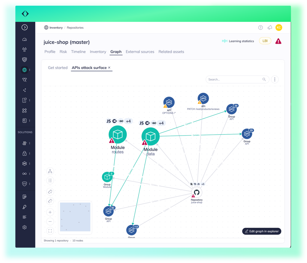 The graph is fully connected to the rest of the Apiiro platform. Teams can pivot between table-based views in Explorer and visual views in Graph, using the same filtering logic and query language.