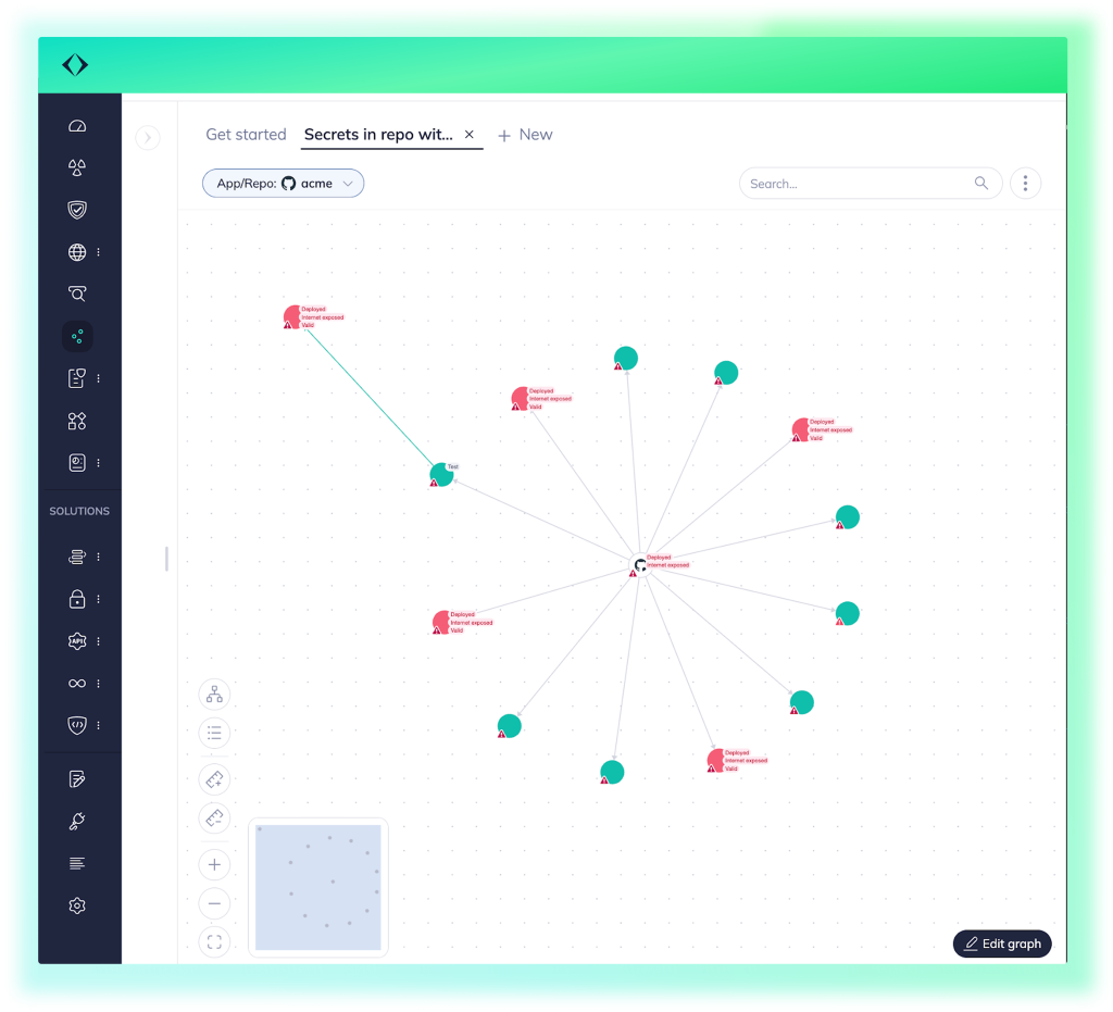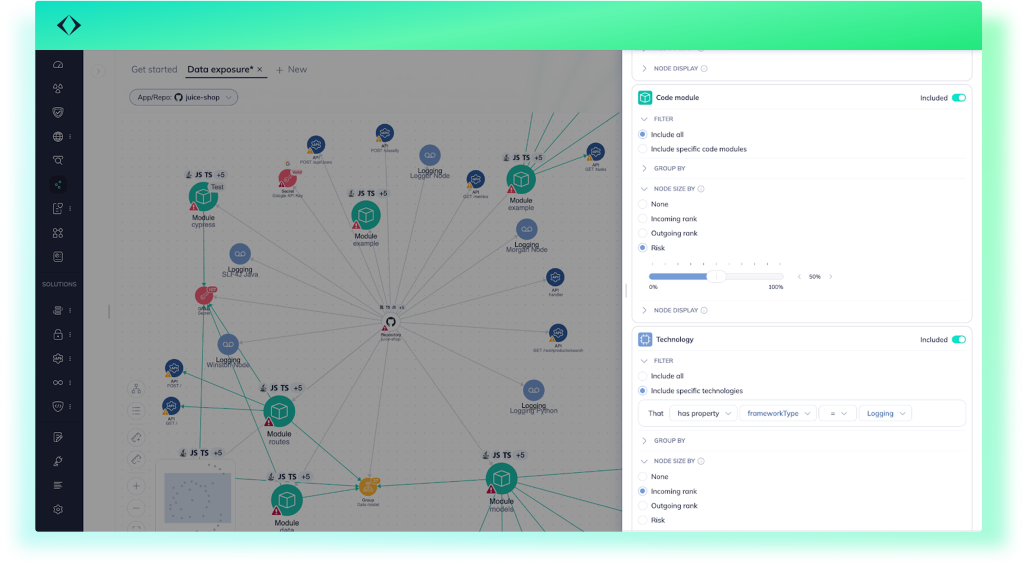 Every entity in the graph is tied to Apiiro’s broader risk analysis engine. The risk level of each node can be used to influence display (e.g. size by risk severity), allowing teams to visually prioritize what matters. This bridges the gap between structural visibility and actual security decision-making.