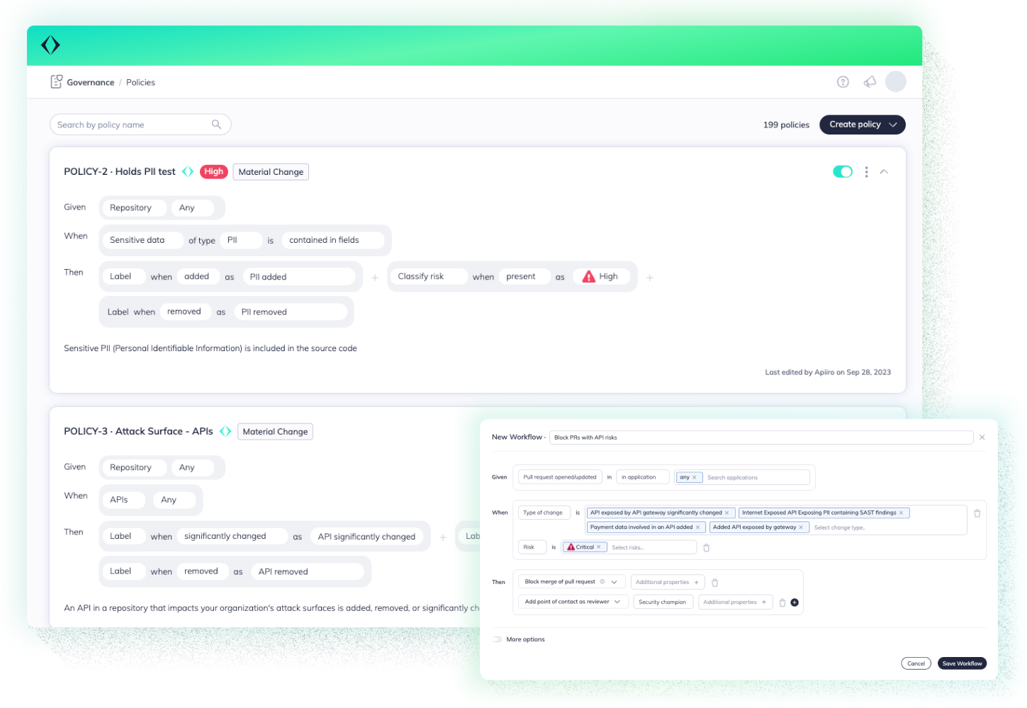 • Apiiro gives AppSec teams the power to define thresholds for what should block a release, helping to minimize unnecessary friction over low-impact alerts.